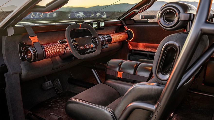 В салоне внимание сразу привлекает чёрно-оранжевый «тубус», расположенный на месте традиционной передней панели. Он крепится к корпусу с помощью держателей по бокам и подвешена на ремнях с пряжками (они оформлены в стиле персонажа Crater Man, изображение которого есть ещё к примеру, на дополнительной светотехнике на крыше). Роль информационно-развлекательной системы исполняют четыре небольших отдельных съёмных дисплея, под ним располагается панель с «крутилками» и физическими кнопками.