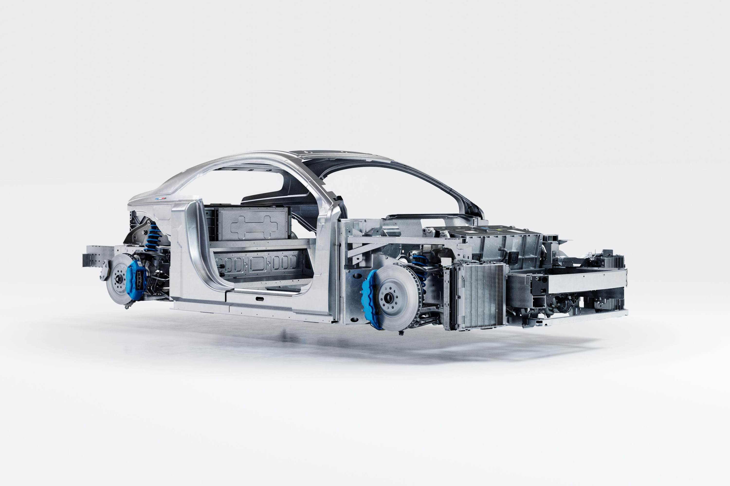 Платформа APP имеет 800-вольтовую электрическую архитектуру, батарея в ней разделена на два блока, они расположены над передней и задней осями — это решение позволило опустить кресло водителя максимально низко. Задний батарейный блок заметно крупнее переднего, развесовка будет примерно такая же, как у современного бензинового купе — 40:60 в пользу задней оси. Кузов и шасси выполнены из алюминия, сварки будет мало, вместо неё — заклёпки и клеевые соединения. Подвеска — пружинная, на двойных поперечных рычагах «по кругу».