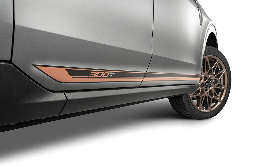 Визуальные особенности версии 300T — это, помимо колёс, развитый передний спойлер, комплект шильдиков Ford Performance, декоративные наклейки с надписью 300T на капоте и боковинах, новые коврики в салоне с вышитым логотипом Ford Performance. Цветовое исполнение пакета 300T может быть бронзовым, как у машины на фотографиях, либо чёрным. Цена пакета 300T пока не объявлена, в продаже он появится в 2026 году.