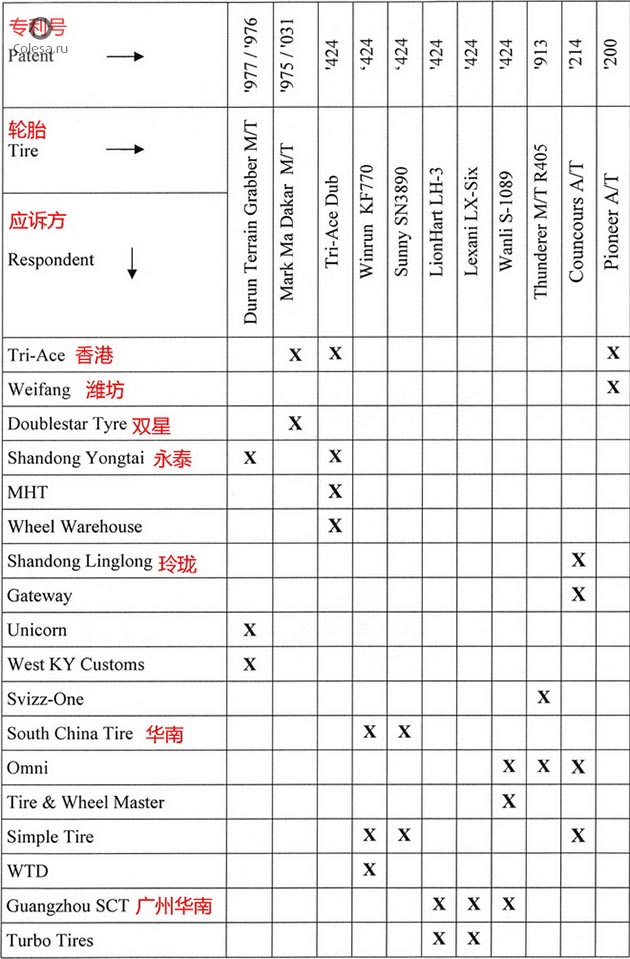 Напомним, Toyo обратилась в ITC с заявлением 20 сентября 2013 года, обвинив 23 компании из Китая, Таиланда и США в том, что они незаконно использовали рисунки протектора шин Toyo и Nitto, защищенные патентами, выданными американским Бюро по регистрации патентов и товарных знаков. До этого 15 ответчиков уже согласились с доводами Toyo и пришли к соглашению с компанией. Toyo также подала заявления в несколько федеральных окружных судов США, и по большей части уже также выиграла все дела.